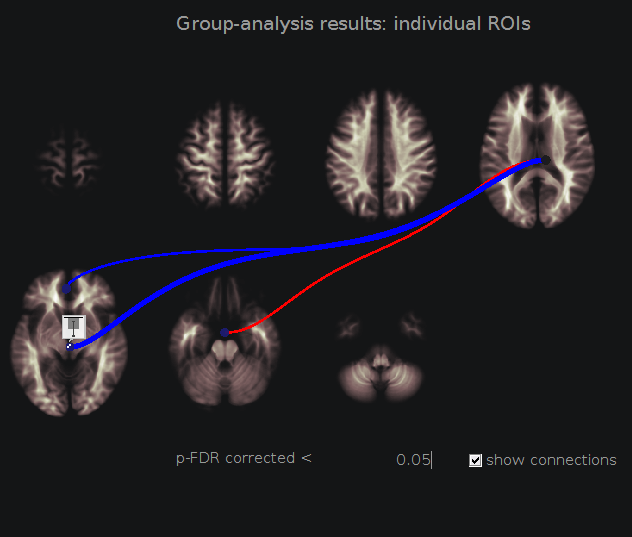 The attached screenshot shows one positive connectivity and two negative (or anti-connectivity) results. However, when presenting the connectivity matrix using the "Group-analysis results: all ROIs" option, all three connections appeared with an orange color.