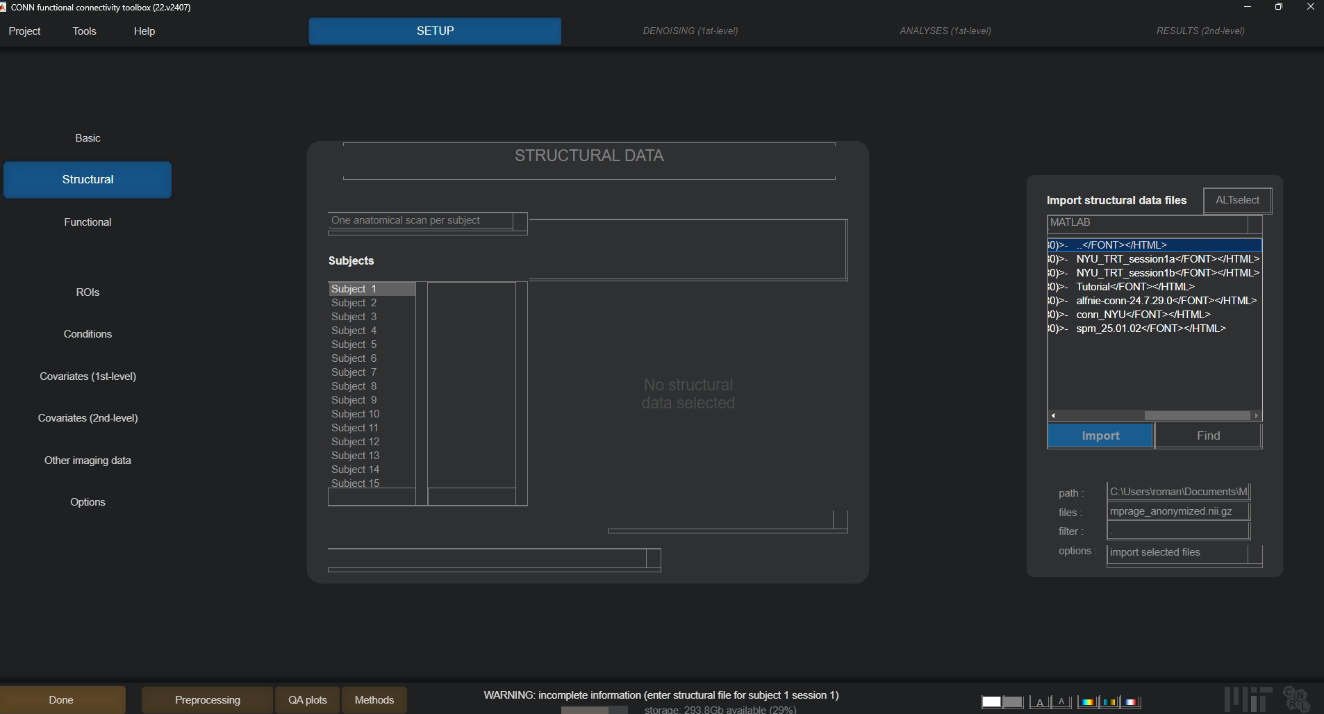 I am new to this field, and recently downloaded Matlab with SPM and CONN. I am following the first tutorial (https://www.youtube.com/watch?v=eUd3k_jI...), and I got stucked while importing files. I want to import all anonymized files by filtering files with "mprage_anonymized.nii.gz". When clicking "find" (on the right in the attached .png), there is not a list with all the 25 files that I am looking for. Without this I would need to import each file one by one. Later on, I will be working with a larger dataset, so it cannot be done this way. I have tried both in Windows and Ubuntu, however clicking "find" does not work as in the tutorial. Is there any way to import all desired files without doing it one by one?