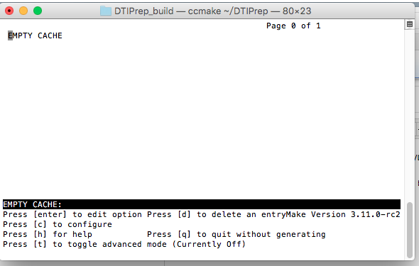 I have install the cmake, but after I run the recommend " ccmake ../DTIPrep", it opened the CMake interface, said "empty cache".