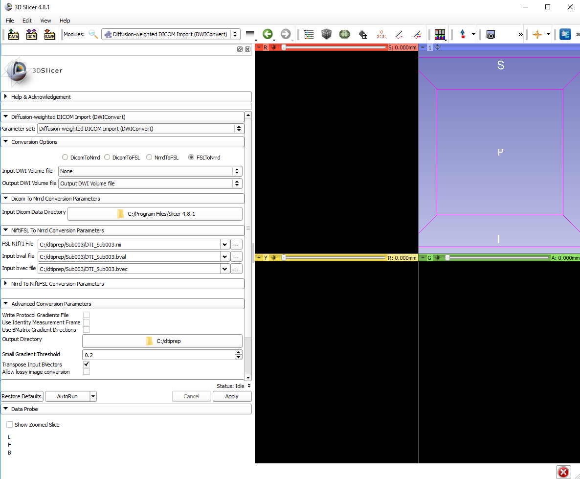 I am current working on a project with DTI data. I want to convert my nifti (nii) to nrrd. I also met some problems when I tried to do NifitFSL To Nrrd in 3D Slicer 4.8.1 in Windows 10, 64-bit OS (I've already converted the DICOM data which collected from Philip to NIfTI nii by dcm2nii) . I set the panel as showing in the attachment.