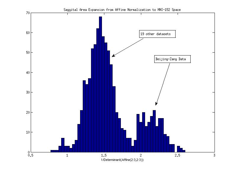 I am concerned that the anatomical image headers for all of the Beijing_Zang data contain incorrect pixel dimensions. In particular, the y and z dimension (ant-pos and sup-inf) axes appear squashed in both the anonymized and skullstripped images. When I normalized either of these anatomicals to MNI space (ICBM-152 in SPM5) the y-z (saggital view) area was expanded by a mean factor of ~2.1 rather than the more reasonable ~1.4 factor that I got with the 19 other fcon_1000 dataset anatomicals that I have processed so far. Perhaps the correct pixel dimensions are approximately 1.33 x 1.2 x 1.2 rather than the stated 1.33 x 1.0 x 1.0? The fit of my normalization seems reasonably good, and the Beijing_Zang anatomicals are of good quality, so I don't think that I have a normalization problem (spm5 normalized all of them without incident). I also obtained an unusually low total brain area for the Beijing_Zang anatomicals when I do a segmentation of the anatomicals and sum the segmentation probabilities for WM and GM.
