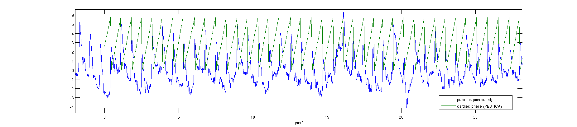 Thanks for your reply; I'm glad I was able to help. We're using PESTICA on subjects for whom we have measured pulse ox data but no respiratory data, and the PESTICA estimates of the peak locations line up extremely well with our measured cardiac data. For advertising purposes, I've attached an image illustrating this for the very first subject I ran through PESTICA. The next thing for me is to hack together a script that gets all subjects through stages 1 and 2, then does everybody's interactive stage 3, and finally crunches stages 4 through 6 noninteractively. It would be really nice if PESTICA could come up with plausible filters and then ask me afterwards whether they were good enough, but I'm having trouble seeing how one would automate that decision.