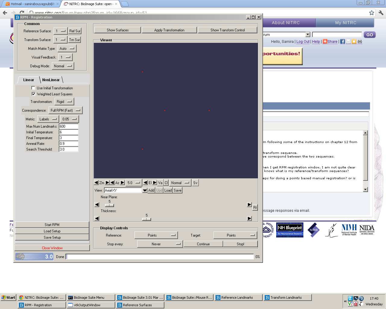 Then I go tot the registration menu and select points based registration from it, and then I get RPM registration window (I am attaching the screenshot to show), I am not quite clear where to feed in the points I have saved as landmarks, nor do I know this window tool knows what is my reference/transform sequences?