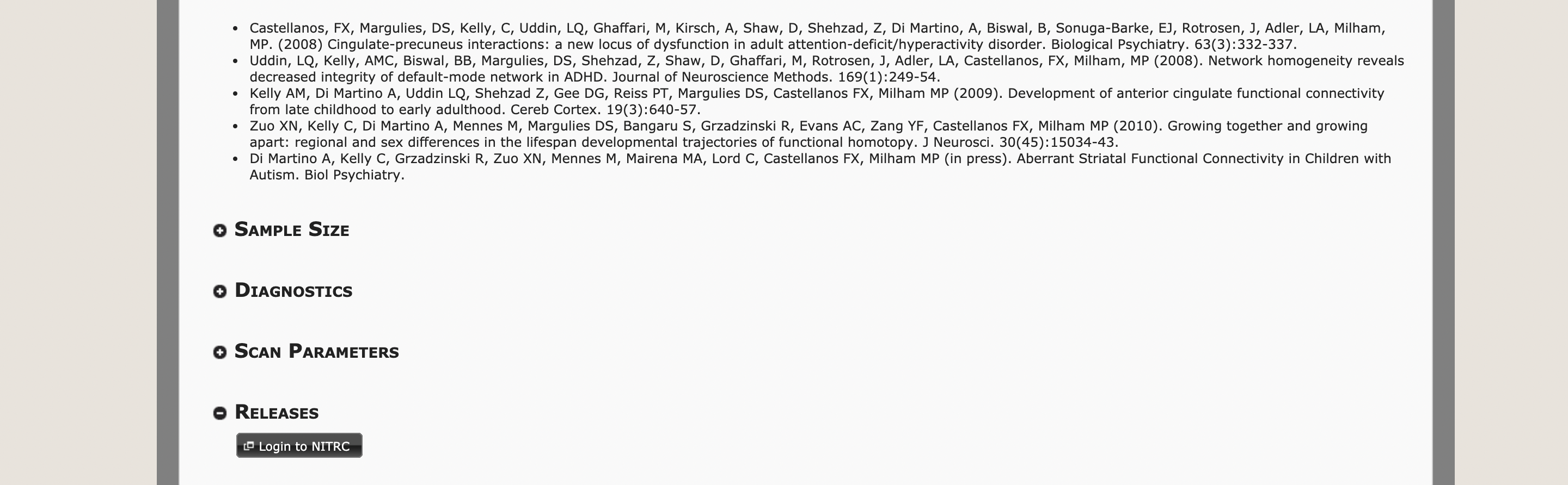 I've successfully downloaded the data from the NYU study in the ADHD-200 project, but the phenotypic file is nowhere to be found. When I click on "Releases" at the bottom of the "New York University Child Studies Center" tab, a button appears, labeled "Login to NITRC"; but upon clicking it, it simply refreshes the page. Would someone be able to guide me through finding the phenotypic file for the 263 NYU participants?