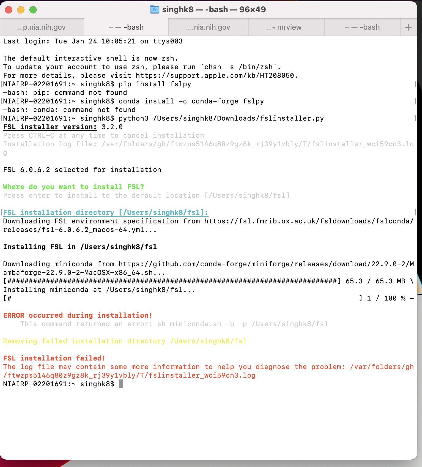 I tried installing FSL in my Mac, but had installation error. I have tried installing Quartz software, and it didn't help me either. Kindly help me in this regard. ERROR occurred during installation! This command returned an error: /Users/niranjan/fsl/bin/mamba env update -n base -f /private/var/folders/gt/4vm51s9s169c1zsj1bm1qhc40000gn/T/tmp06t7a8hv/fsl-6.0.6.2_macos-64.yml