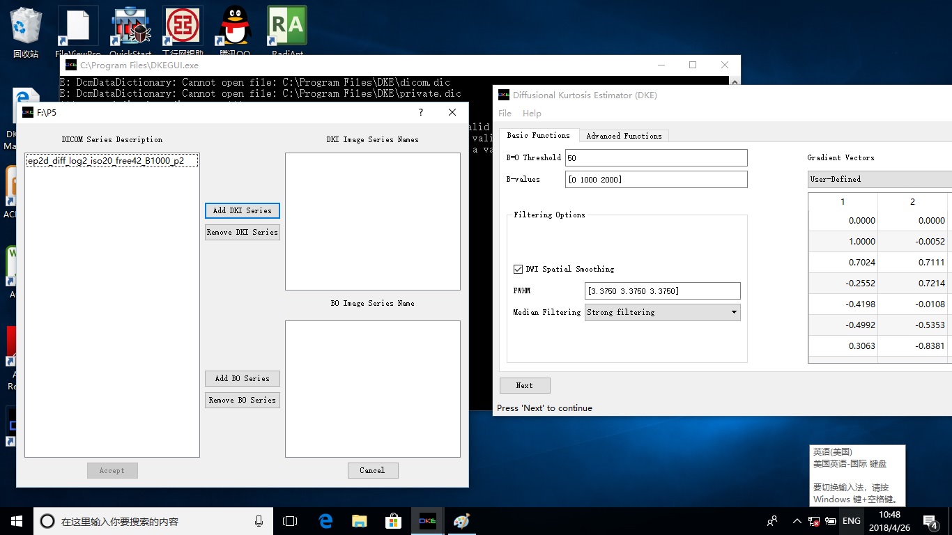 I wonder if anyone come across the same kind of problems. My data is based on EPI sequence and the file name is ep2d_diff_log2_iso20_free42_B1000_p2. But when I begin to run DKE with the data, the console window reads as followings,