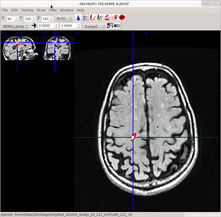 The image is of the T2 registered to the T1 and overlayed with the pmap displayed at a .5 to 1 threshold. This test subject was pre-processed through the W2MHS program and had the default, 2.5 cleaning threshold as well. You can see from the attached image that the program is identifying major hyperintensities (although not some of the smaller ones in this particular slice), but more importantly, is missing the center of the hyperintensities. The probability for the voxels along the edge of that hyperintensity are slightly above .5, while the voxels in the center are around .2.