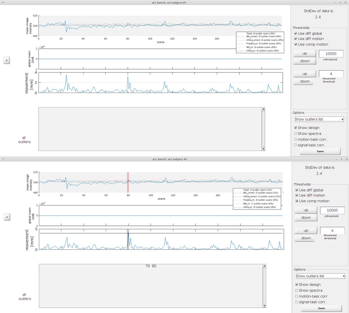 We recently noticed that differences in outlier detection are observed when using analyze format (.img/.hdr) vs 4D nifti (.nii) format images. While the motion parameters appear identical for a single subject, upon closer inspection the scale (in mm) is slightly different between the two processing pipelines. Screenshots of the two art outputs are attached (analyze on top, nii on bottom). Both images were converted from dicom to img or nii using dcm2nii, and converted from 4D to 3D in SPM prior to any preprocessing steps. After unpacking, images were then slice time corrected, realigned and unwarped (all in SPM12).