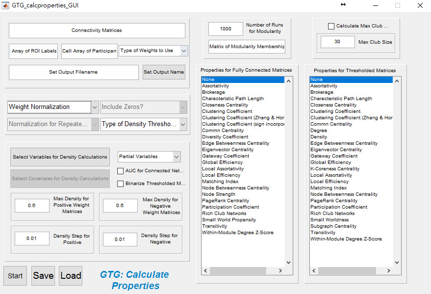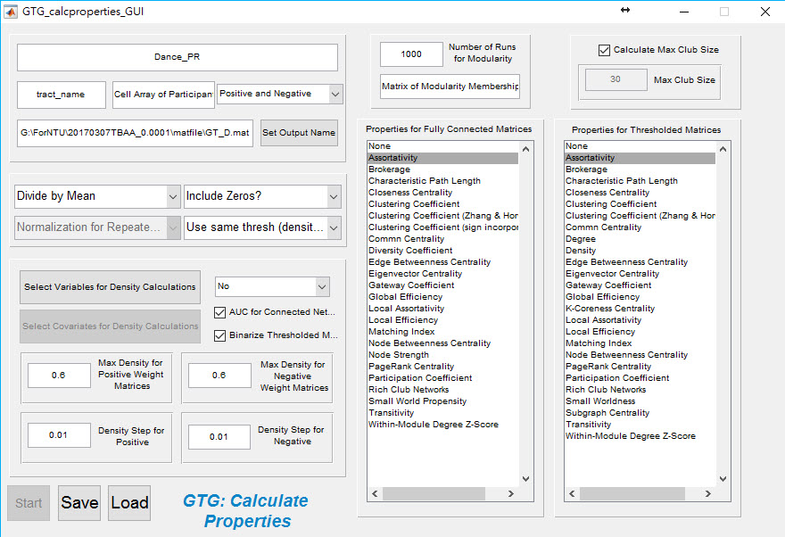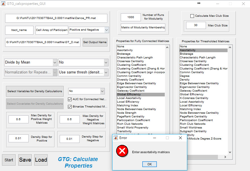 I'm having some difficult at the Calculation of Graph Properties stage. After I "set output name" I hit the "Load" button on the GTG_calcproperties_GUI, a Finder window pops up with my directory. I selected a self-created connectivity matrices, which is a white matter tract strength map in dimension of p x p for p ROIs. After I've done this, and then I receive this error message: