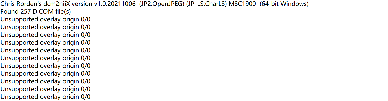 When I am attempting to convert some DICOM files to nii.gz, the following message appears: Unsupported overlay origin 0/0, as shown in the attachments. I wonder if this will have any impact on my subsequent processing. I would appreciate it if you could solve my confusion.