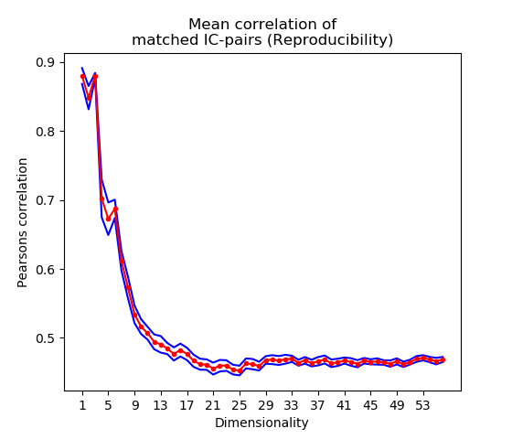 The Pearson correlation coefficient produced by the program `fslcc` is computed for each pair (1 to N) of D decompositions. At each repetition, the similarity matrix shows how similar component 1 in group 1 is to component 1 in group 2 (after sorting components with munkres). The final reproducibility estimates are generated by averaging the diagonal of each of these matrices N times for each of the D components.