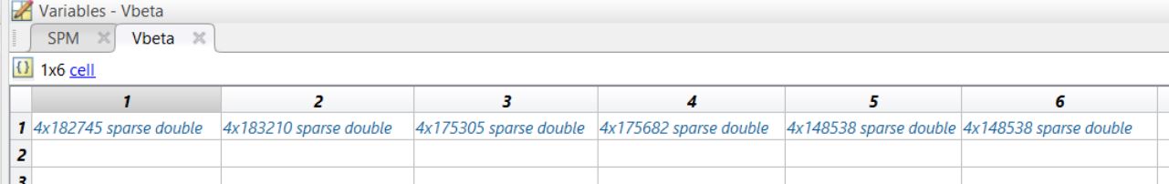I created a Vbeta.mat file and I was wondering what the arrays in this file represent. My experiment consists of 3 conditions, and the Vbeta.mat file of HBo is a 1X6 cell array. Each cell contains a 4Xi sparse double.