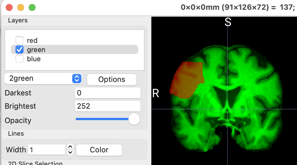 To achieve this, I open all three channels of my image in MRIcron. Then, I begin the segmentation process on the green channel. My question is: how can I ensure that the regions I've marked for segmentation on the green channel are visible or highlighted when I switch to view the red and blue channels? I need to ensure that the exact areas segmented in the green channel are accurately reflected and can be compared in the other two channels.