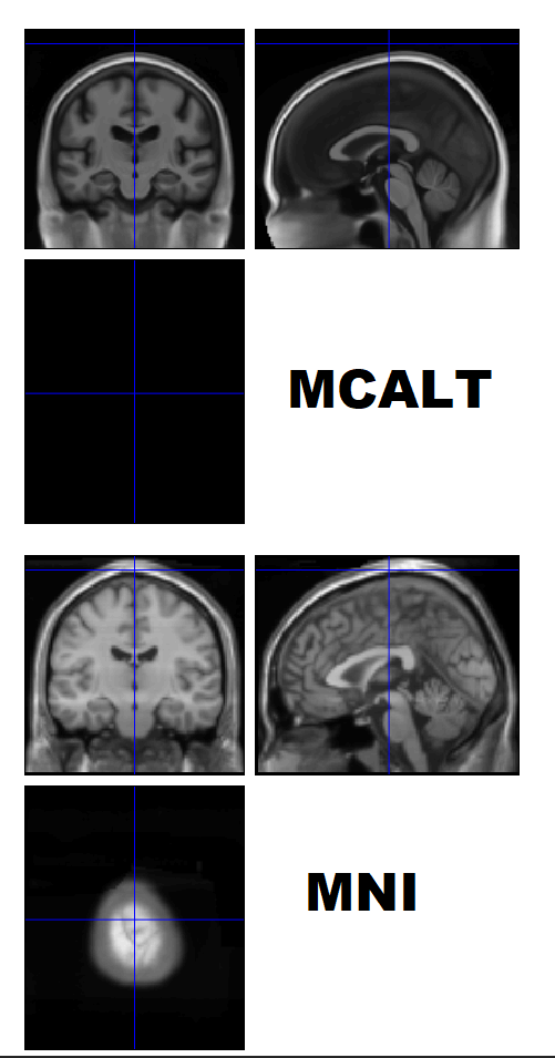 I just downloaded MCALT atlas and found that dorsal skull edge of the MCALT atlas images did not match the dorsal skull edge of MNI template included in SPM12 or WFU pick atlas.