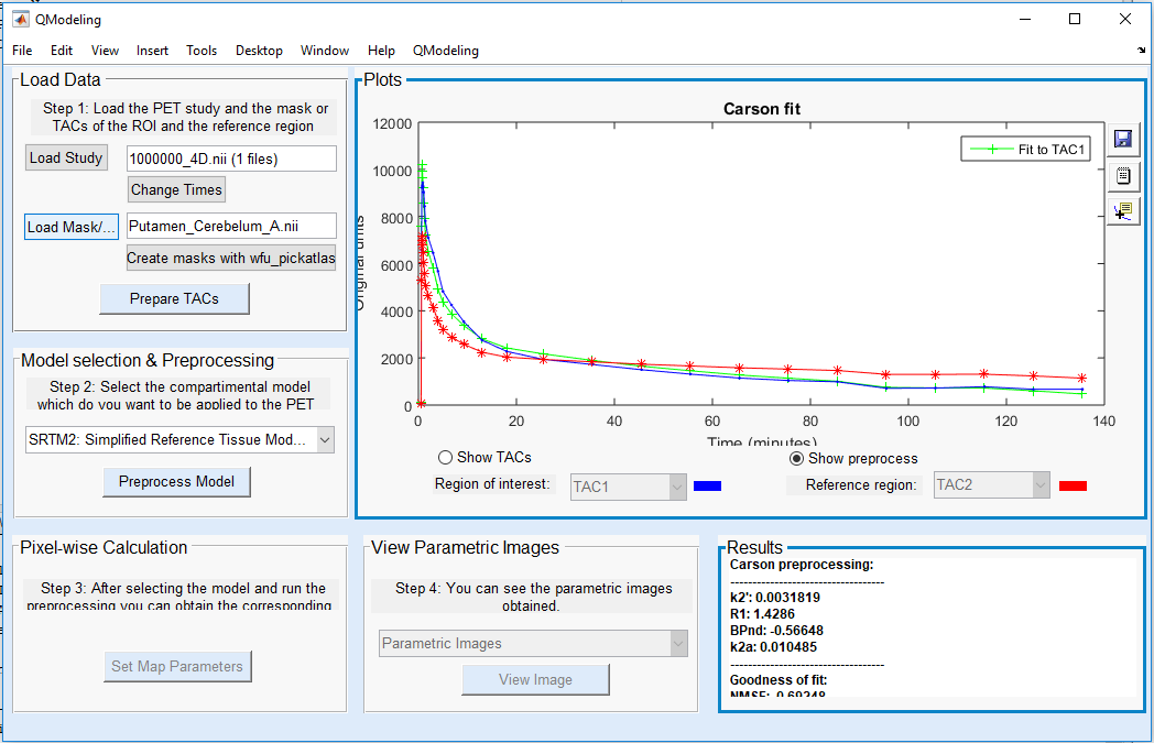 I Loaded my dynamic image in NIFTI format, then I loaded my mask in NIFTI format (for example my reference region is cerebellum, my ROI is Putamen), then the software asked me to load a .txt files for the mask, so I loaded it. I can then prepare the TACs and process the model (SRTM 2 for example). I obtained my Fit curves and my parameters. But I don't have access to step 3 for the wise Calculation. Is there anything I missed?