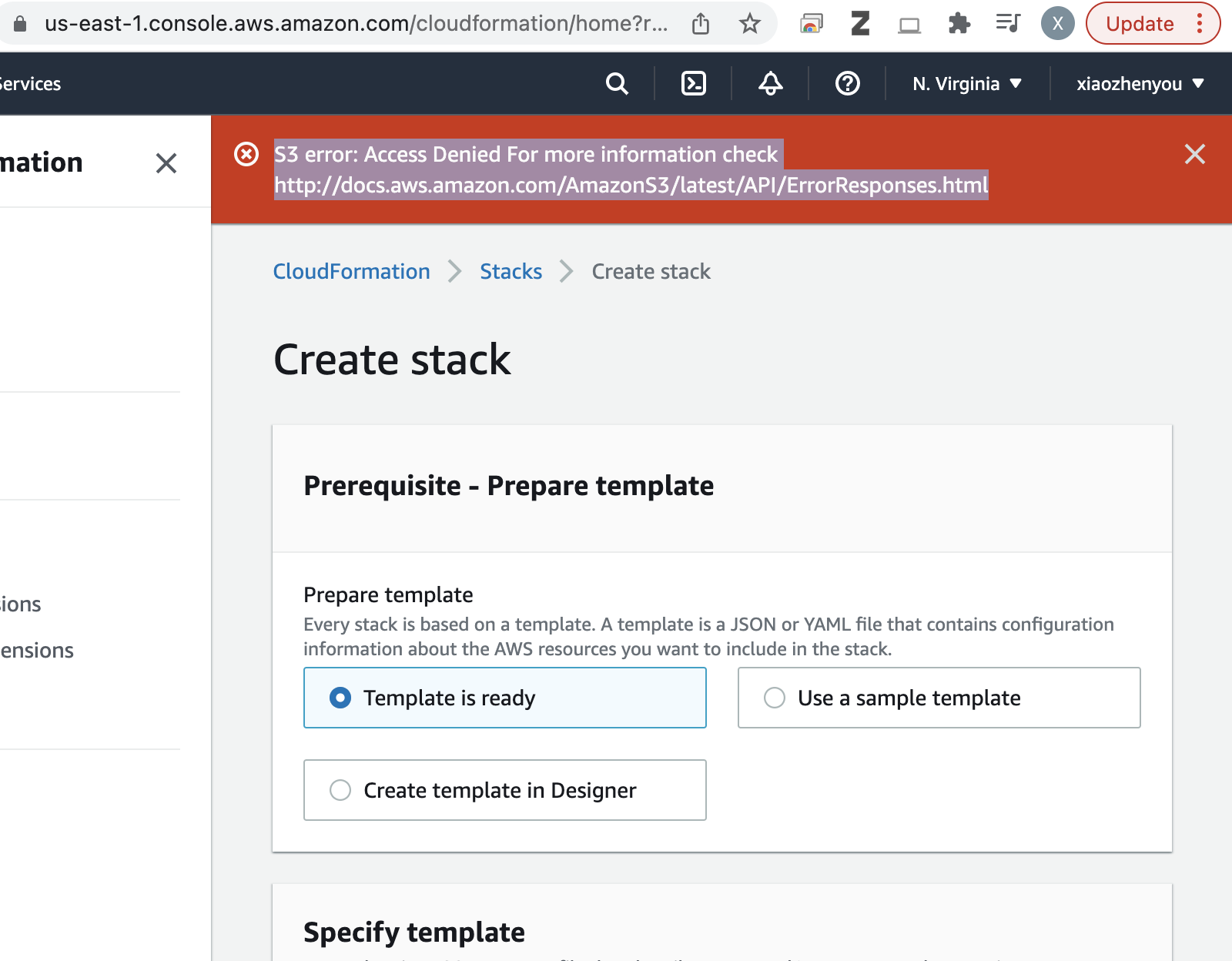 but When i tried to follow the instructions on the youtube link there is the error message on the first step to create stack.