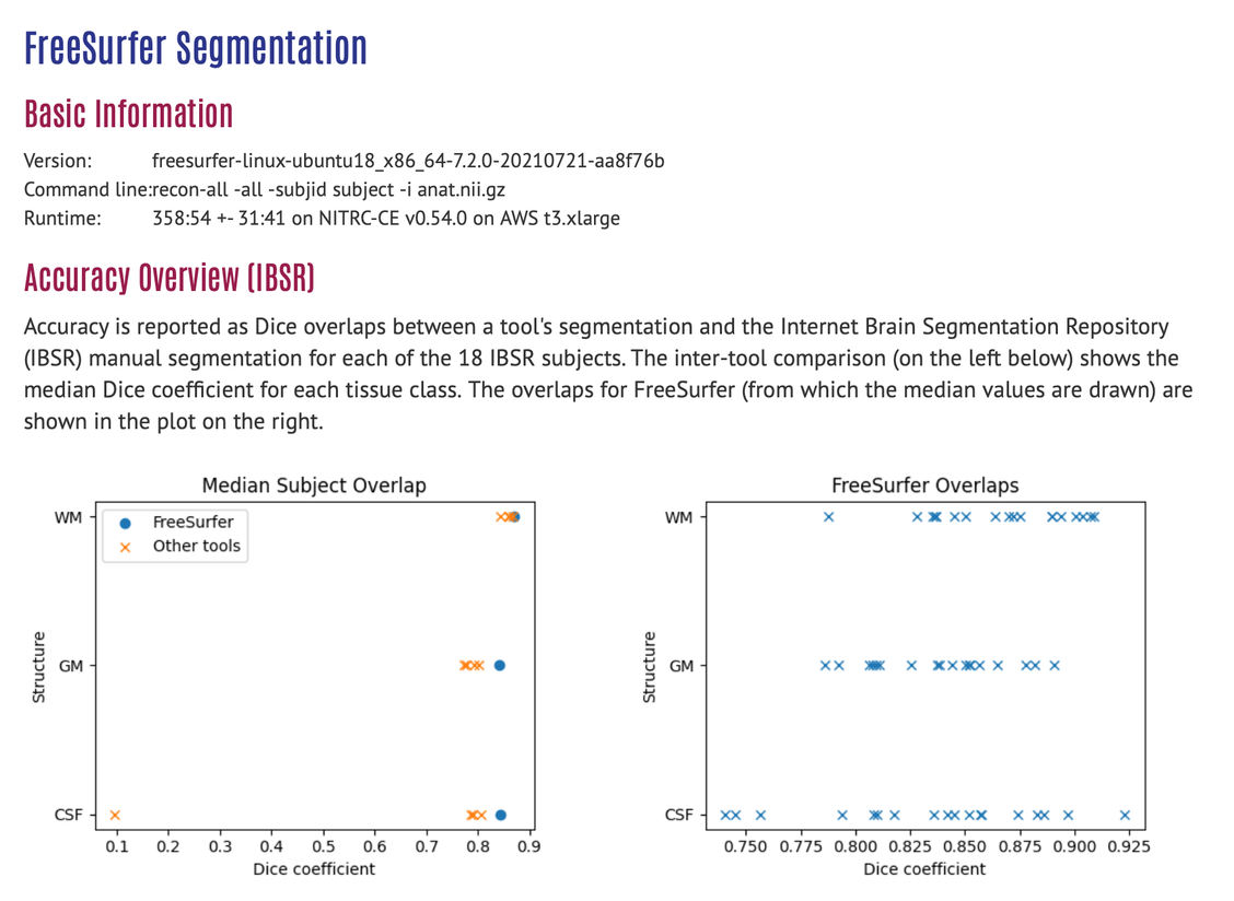 NITRC now reports performance data for image segmentation. For segmentation tools, we report run time, accuracy compared to Internet Brain Segmentation Repository data, and test-retest stability using Brain Segmentation Testing Protocol data. Sample images of segmentation results are also provided for qualitative analysis of results.