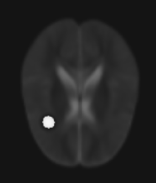 Moreover, the tumor appears abnormally bright or abnormally dark in the DTI output files, depending on the tensor component under consideration. As an example, I included a slice from the Dxx volume of Sim_071_modified_dti.mha.