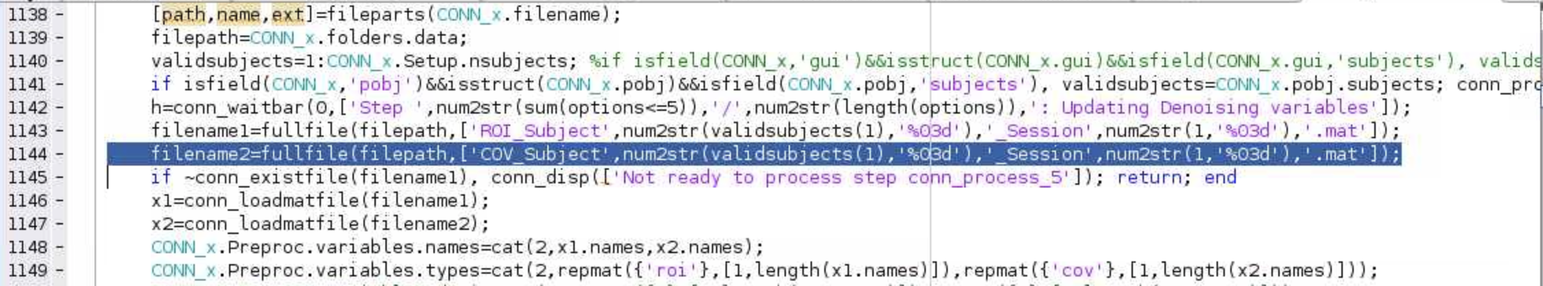 Hello, Thank you for any assistance you can provide. We have a single-subject design where different sessions use different regressors which we would like to analyze. However, I am not sure how to go about setting up denoising, as it seems the code only ever looks at session 1 for what covariate names are possible (see screenshot of line in question from conn_process). Has anyone worked around this / have any suggestions for best denoising practices? Thank you in advance!