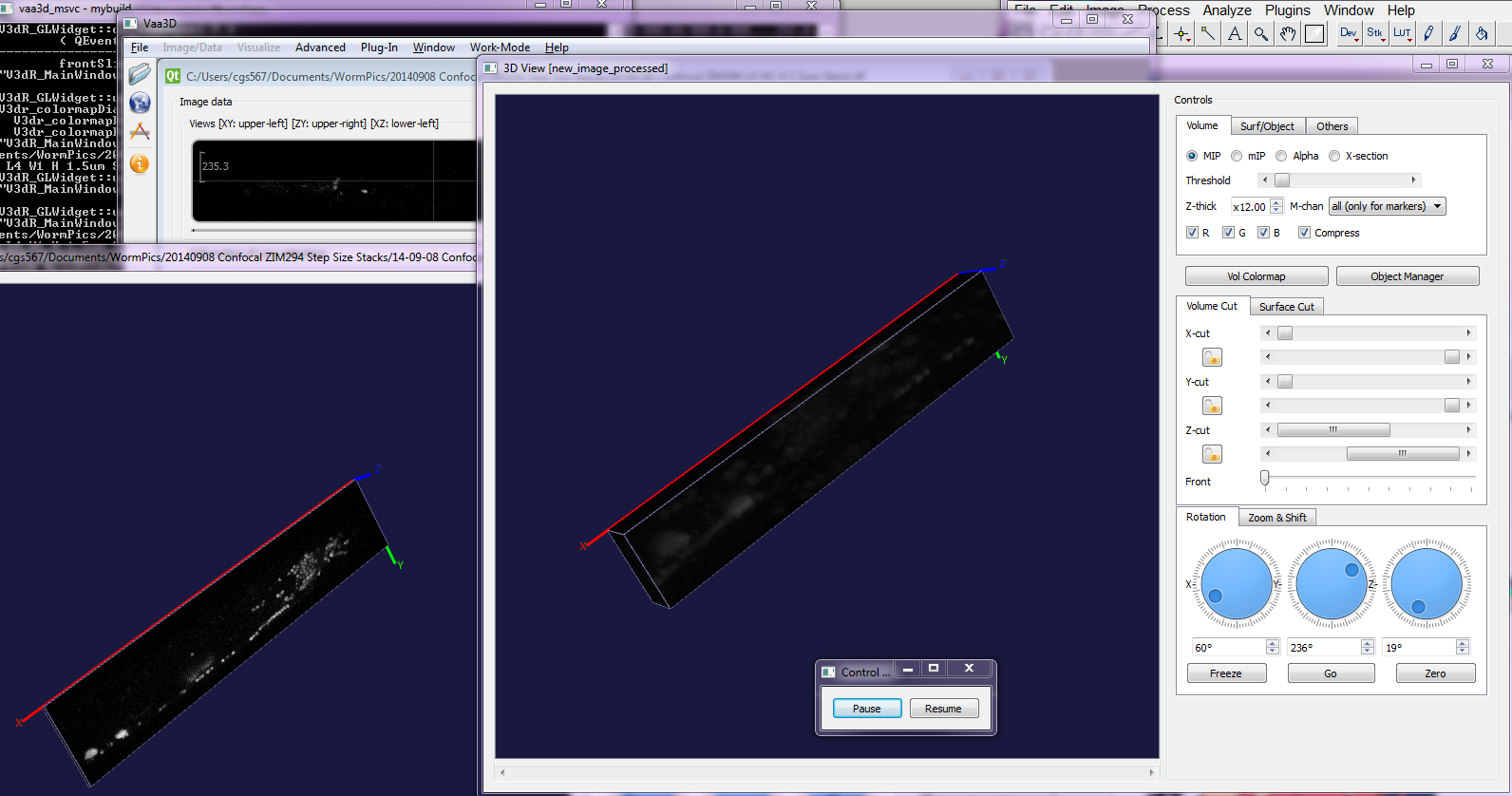 1)The program works fine unless "show segmentation" is checked. If you check that box, the program seems to go on indefinitely. Also, in this mode a [pause, resume] dialogue box will not appear.