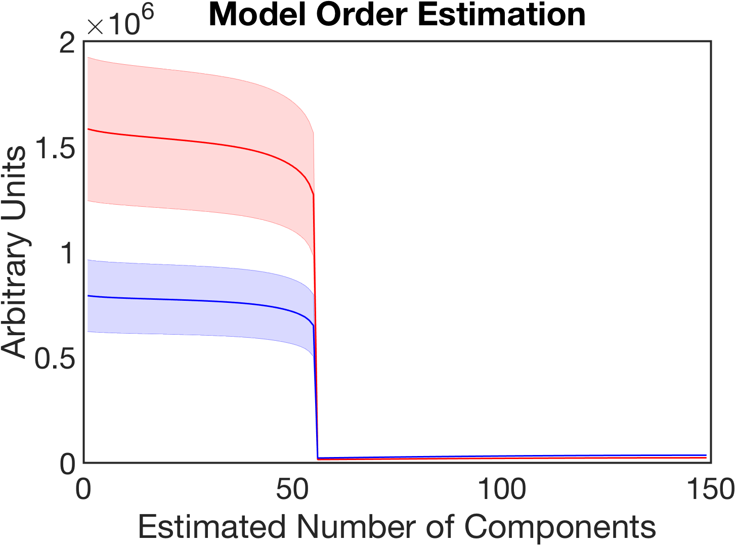 There are all sorts of issues I ran into trying to implement this on my own (memory issues nonwithstanding) so I have been using existing implementations. I've managed to estimate MDL for each individual subject's denoised data using the icatb_estimate_dimension.m function in the GIFT toolbox. However I'm not too confident in the results since the MDL estimate hasn't been performed using the group level data but rather individual subjects (which all turned out to be 56...). I've attached a plot of the MDL/AIC estimate with shaded error bars across subjects. Does this look right to you?