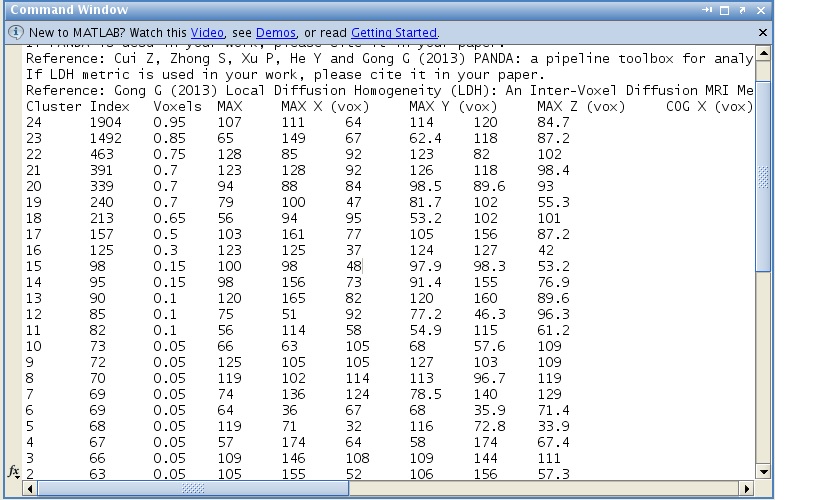 1, Using Cluster Locater in PANDA-utilities, I noted that in MATLAB Command Window shows a list of variables, including Voxels MAX, MAX X (vox), MAX Y and MAX Z, as well as COG X, Y and Z. I wonder what the meanings of these variables are.