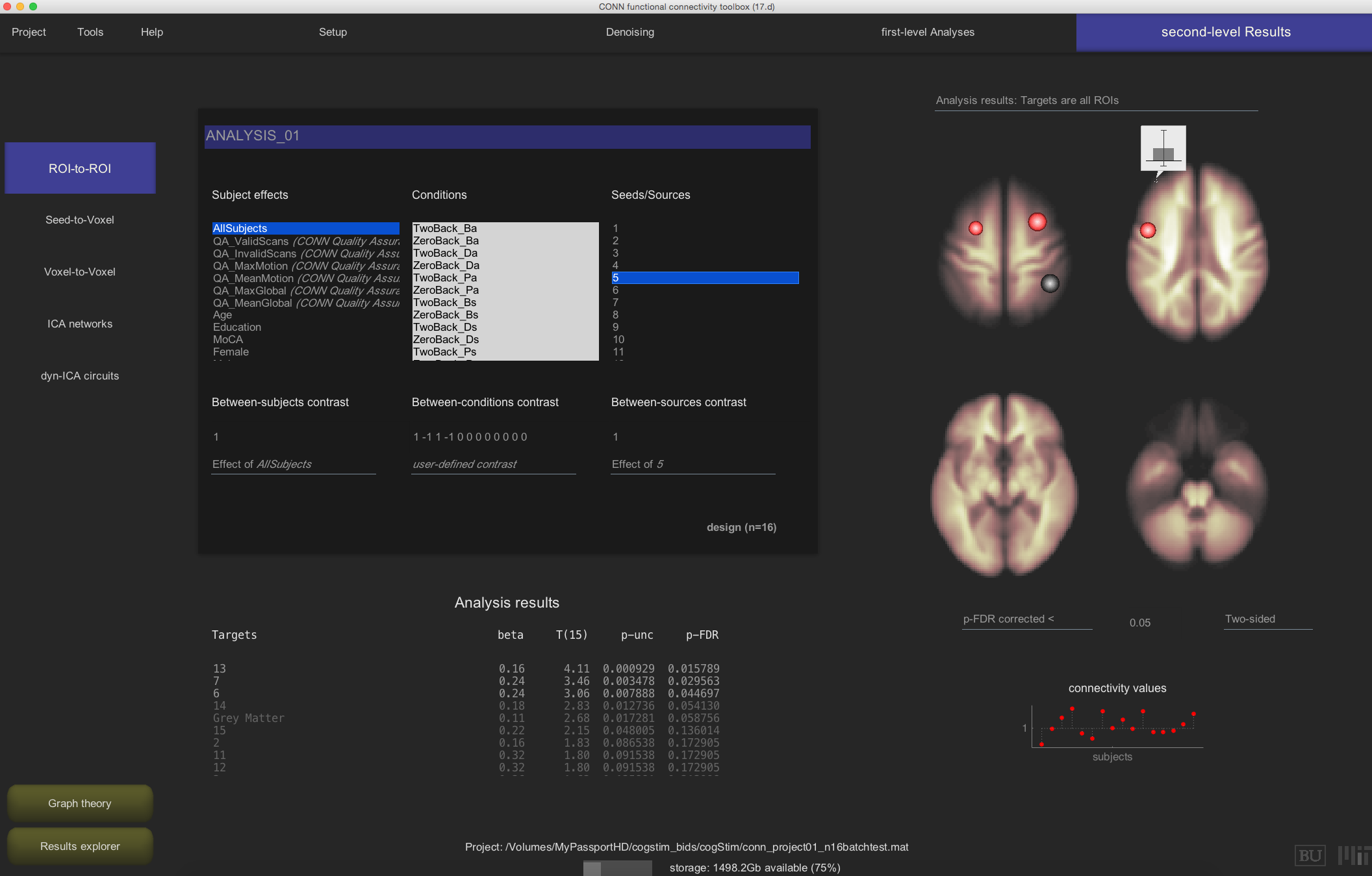 My question: in the attached image, seed 5 has significantly increased connectivity to targets 13, 7, and 6. With this contrast, I am interpreting this to mean: connectivity is increased during active stimulation for 2>0 relative to baseline active 2>0. Is this correct? Or does this result mean: Increased connectivity is occurring in the baseline active condition relative to during active stimulation?