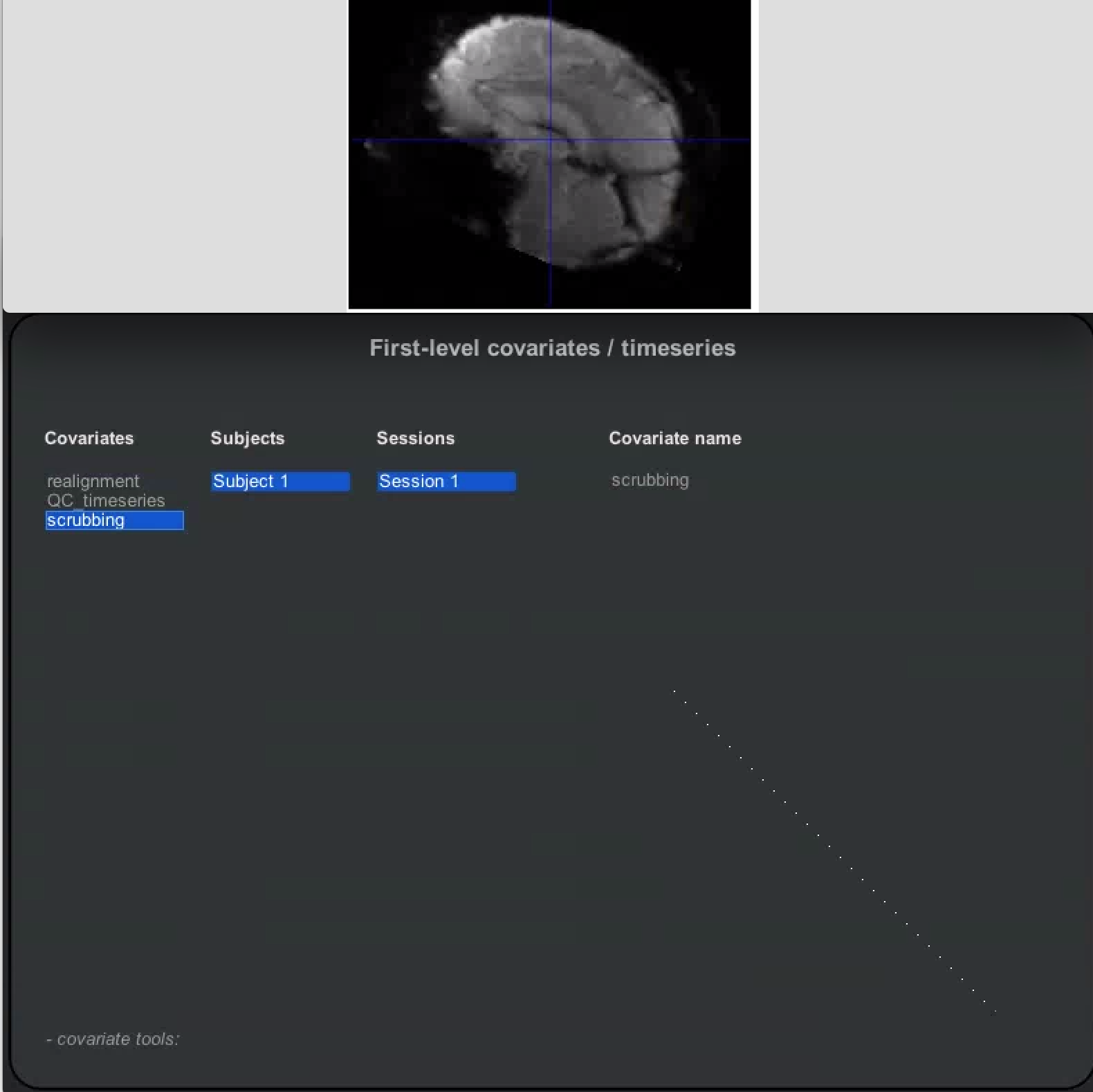 In addition, the scrubbing covariate appears with a diagonal of dots (see attachment) and the functional data are being reoriented by tilting the head up (see attachment).