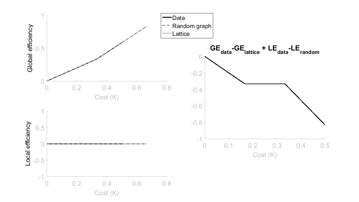 A second question concerns if it would be theoretically possible to test a three nodes network. If yes, how can we chose an adequate threshold, since the data fully overlap both with random and lattice graphs when selecting cost as threshold (see attached file)?