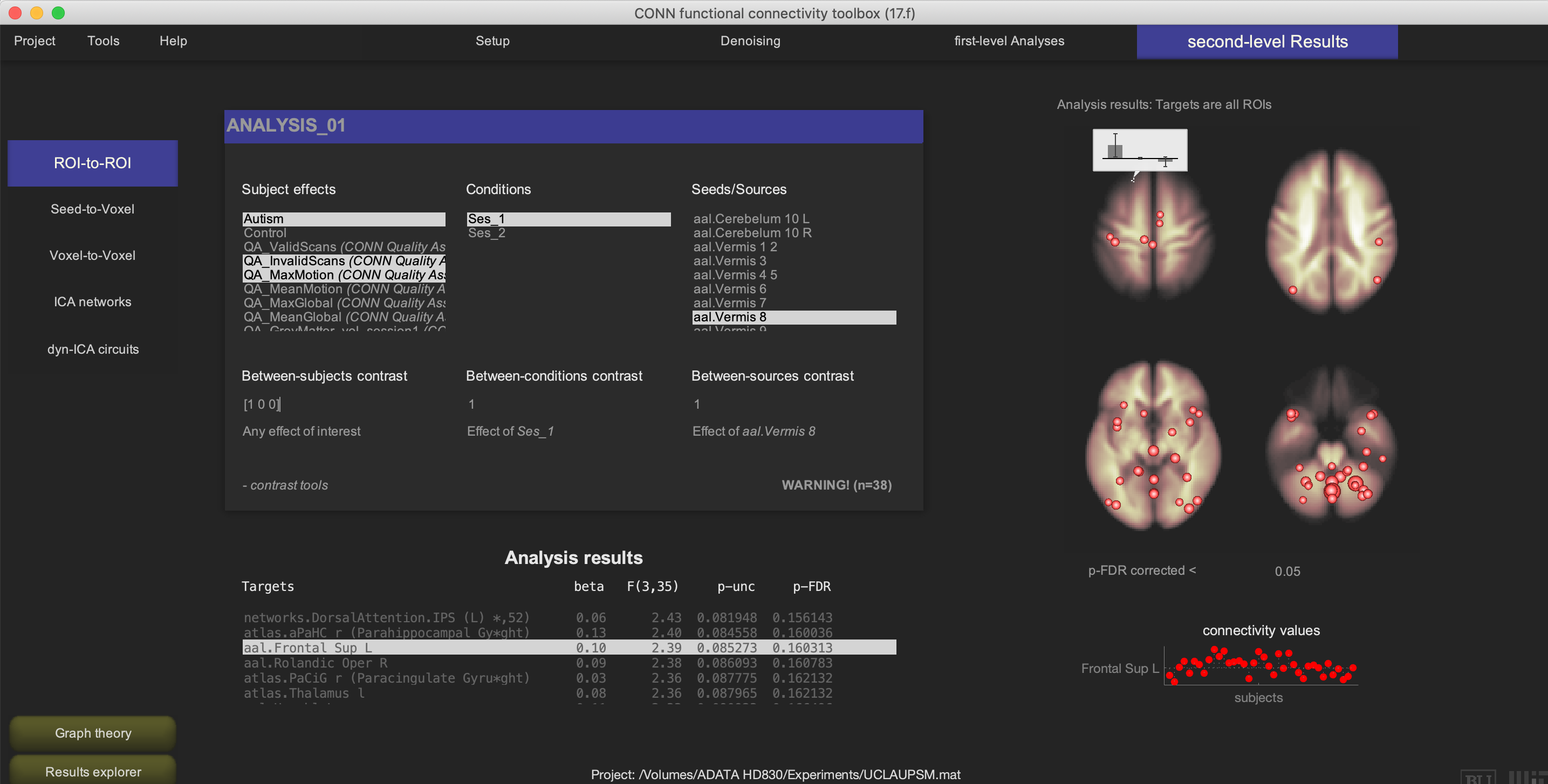 I have two groups (autism/control) that I had defined as 2nd level covariate in setup. Now in the 2nd level analysis, to see ROI-ROI connectivities of each group I simply select it from the Subjects Effects and click on Results Explorer, which gave me the ROI.mat file. Is this wrong? Because I wonder if I should manually include QA_invalid scans and QA_MaxMotion and set my contrast to something like [1 0 0] in order to exclude invalid scans and scans with large motion before running the analysis? But on the other hand I suppose these corrections has already been done during the preprocessing step, so maybe there is no need to manually include them in the design matrix of my 2nd level analysis, and QA_ covariates are just there as reports?