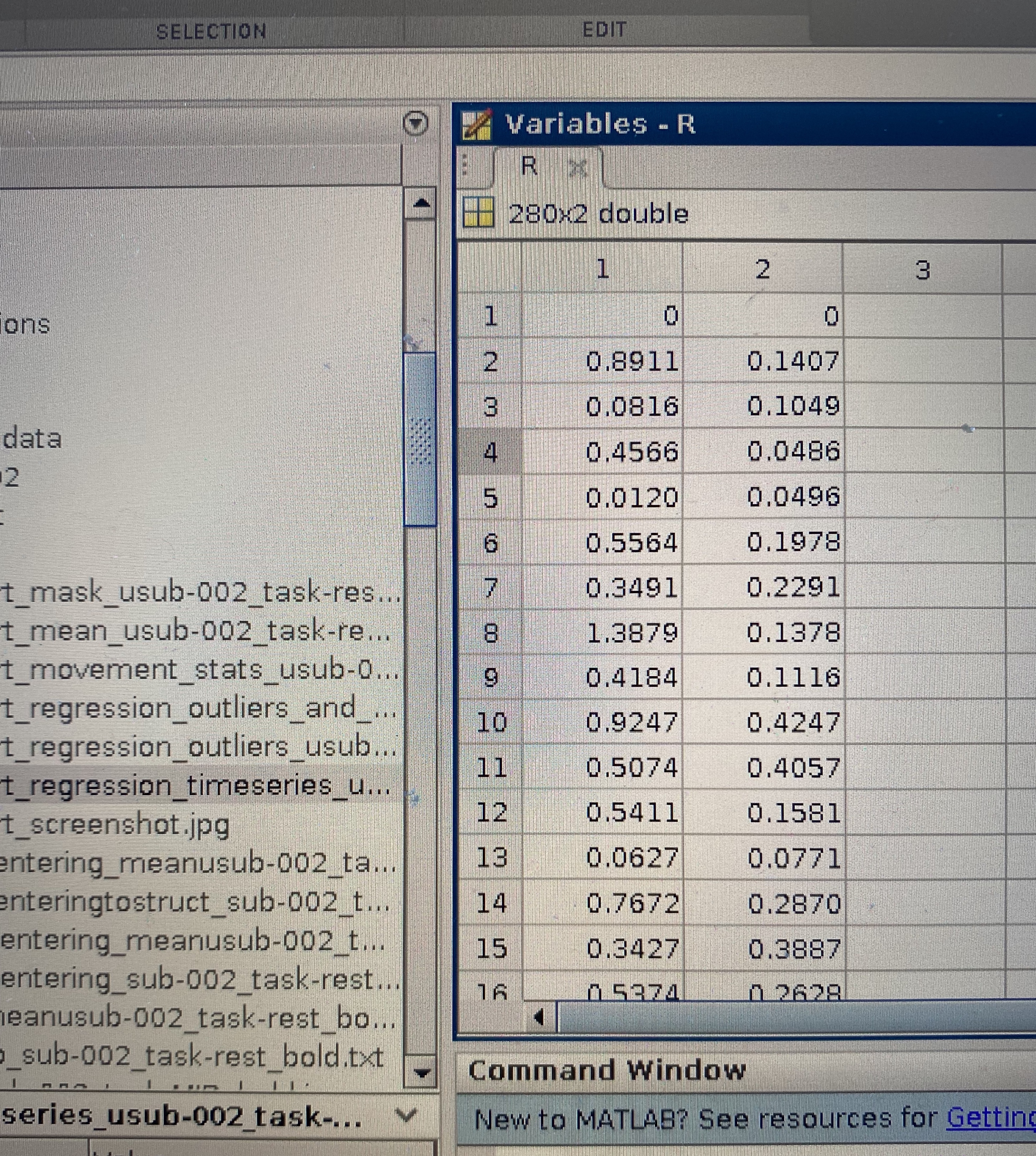 I am getting a .mat output from ART "art_regression_timeseries_..." that consists of a 2x280 double. I'm assuming the 280 are my TR by TR timepoints, but I'm not sure what the 2 columns represent.