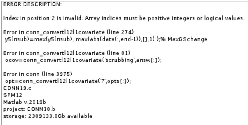 I'm stumped trying to create a new scrubbing covariate using the FD power metric (instead of ARTs default). I use the conn_convertl12l1covariate command (or the GUI) to create my QC_FDpower variable no problem. When I select this new variable as the input for a scrubbing variable it throws an error message (see attached). I looked at the help for the conn_convertl12l1covariate command and it indicates that scrubbing assumes the input contains both the BOLD signal change & the FD change as in QC_timeseries. How can I proceed?