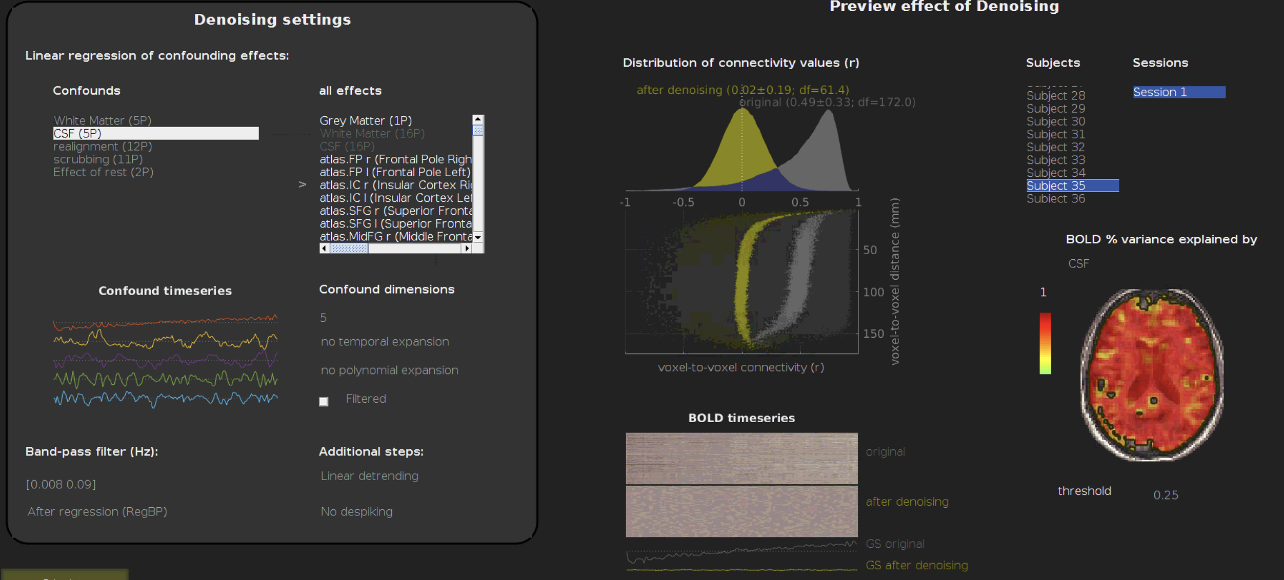 My issue is that when I preprocess and denoise these resting state in conn, the denoising step is not good, especially for the CSF compound : for example here is 1 subject (see attached file), the denoising is really bad, and when i raise the threshold, there is explained variance by the CSF almost everywhere except in the ventricules... I specify that my ROI images for grey/white matter and CSF are good enough, and aligned with MNI space for the "bad" subjects".