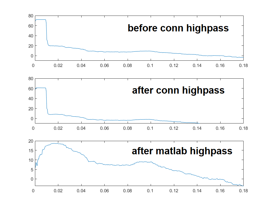 Afterwards, I extracted the global signal from both the raw data and the corrected timeseries. When subsequently computing the power spectrum for both timeseries, I am still getting a large peak in the very low frequency range. For comparison I used MATLABs highpass function on the raw global signal and computed the power spectrum in a similar way (see attached figure). The latter looks quite different, with very low frequencies being suppressed more clearly.