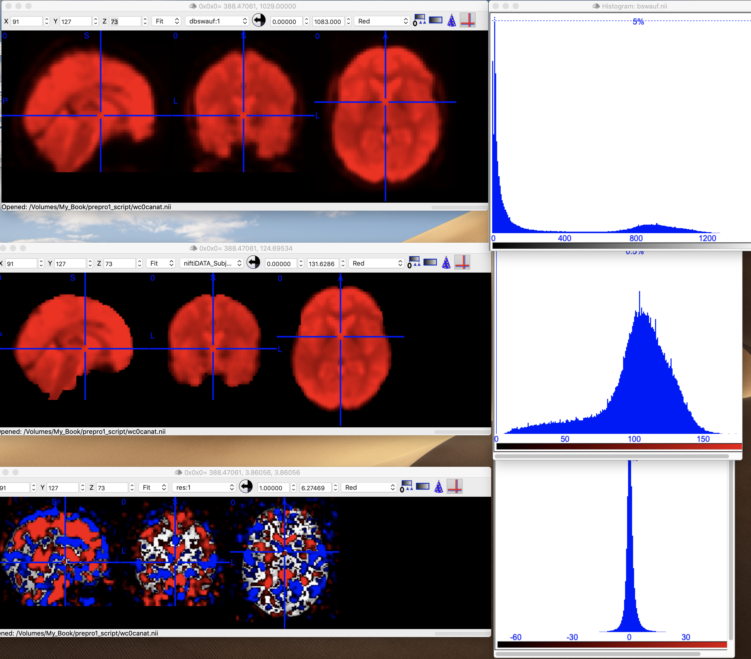 The outputs are very different in terms of distributions (histograms) and spatial patterns (masked to skull stripped brain).