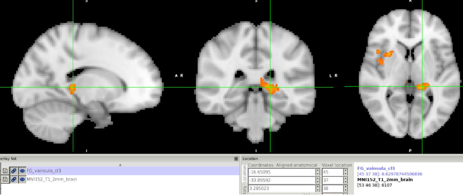 I also looked at the cluster.nii file in FSL eyes, and it seems that the values within that cluster were positive (see attached figure). But this still does not explain why I can't see anything in CONN display.