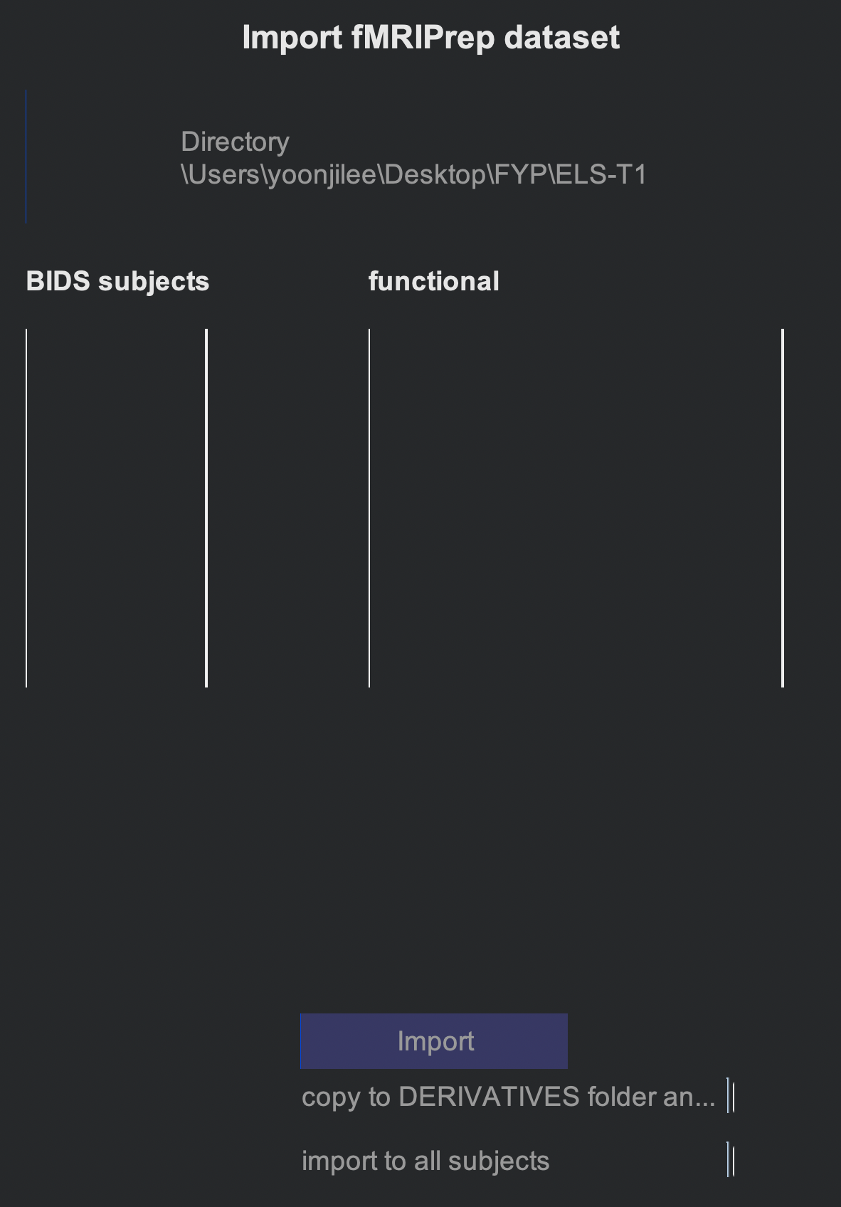 When I import the directory, it successfully detects the folder and the matched files, but the panel that's supposed to show the BIDS subjects and functional files are empty. Why would this be?
