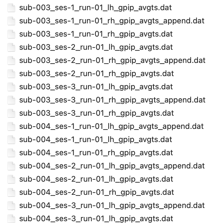Given that I used freesurfer's functions for individualized parcellation and timeseries extraction, each subject (at each time point) has two .txt files corresponding to each hemisphere. (Please see screenshot; some subjects have left hemisphere stimulation site, and some in the right).