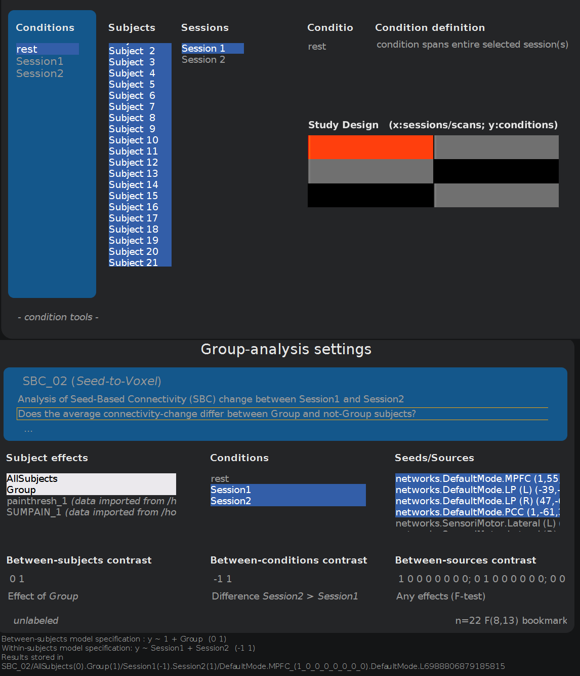 Actually I'm quite stuck at Results(2nd level) screen. I have a subject effect variable called Group, that has 0-s for controls and 1-s for patients, and the AllSubjects. I have 3 conditions: rest (1,1), Session1 (1,0) and Session2 (0,1).