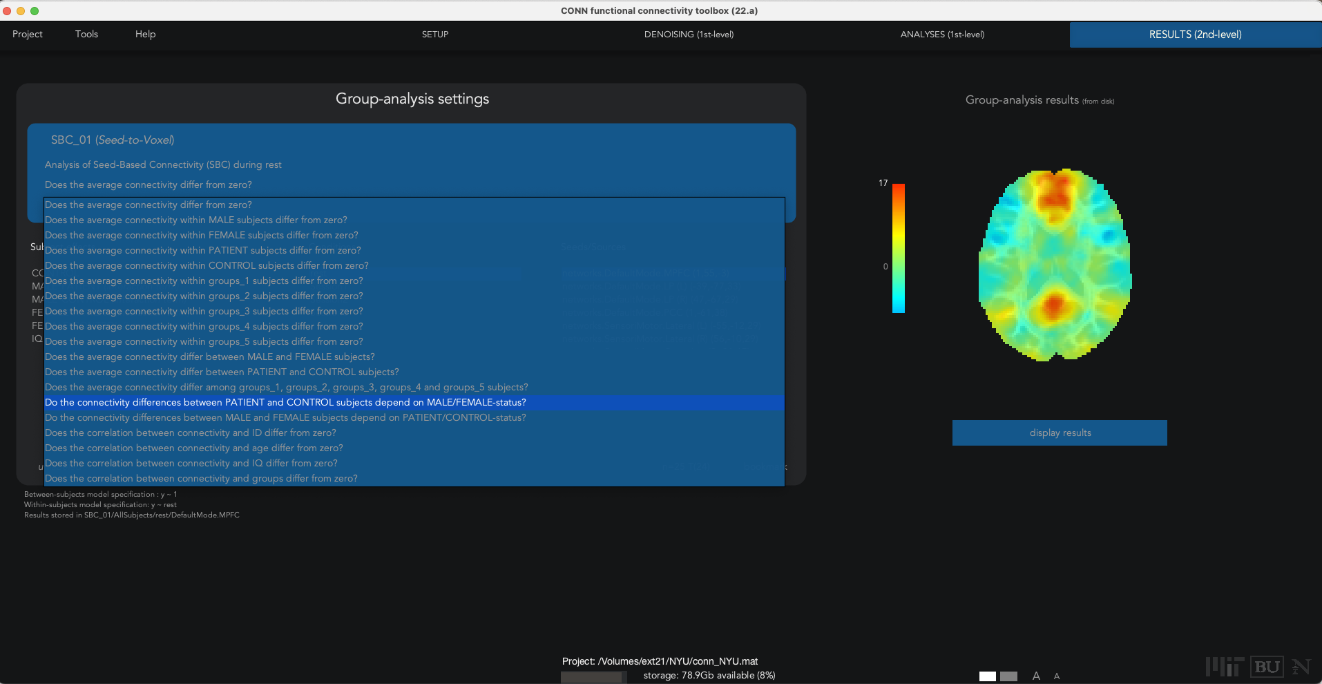 (note: also, if you have the above variables, CONN will "notice" their structure and offer among the default analysis choices one that reads something like: "do the connectivity differences between CONTROL and EXPERIMENT subjects depend on MALE/FEMALE status?" which corresponds to exactly the above contrast; see example image attached)
