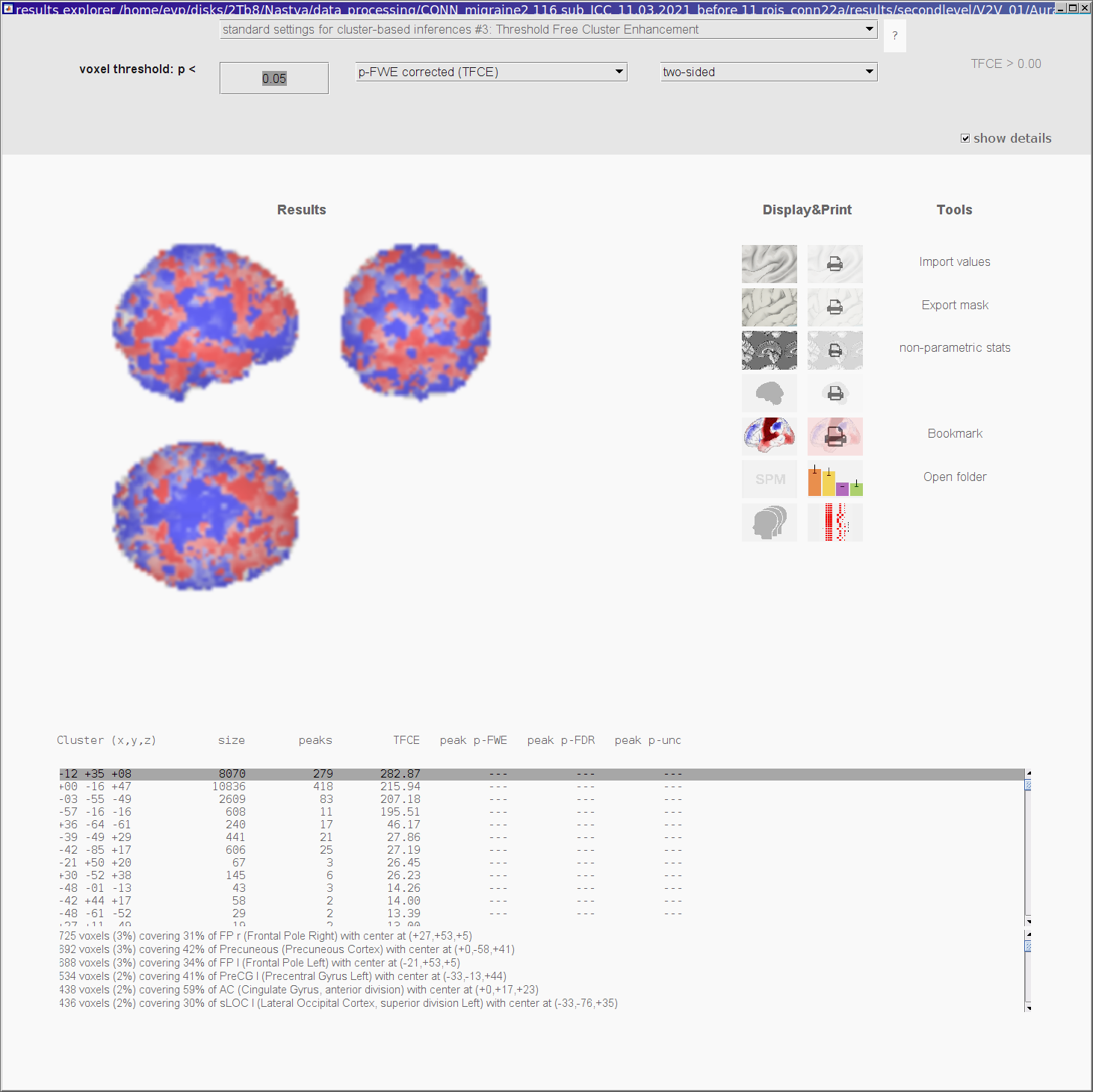 The results screen illustrating TFCE on Conn site looks very reasonable and different from mine: https://web.conn-toolbox.org/fmri-method...