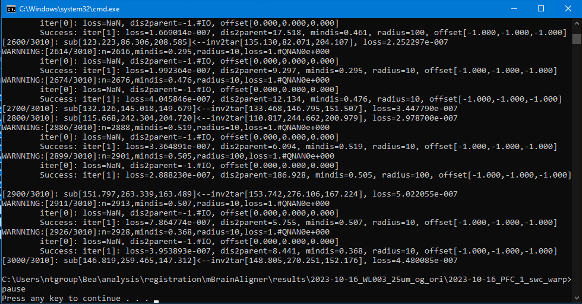 Hello, I have a whole-brain neuron reconstruction which I would like to register to the CCF using the swc_registration function provided with mBrainAligner. The function outputs a global_data.swc, FFD_data.swc, and resample_data.swc. However, it terminates before outputting local_registered_data.swc when I run it on my own reconstruction.