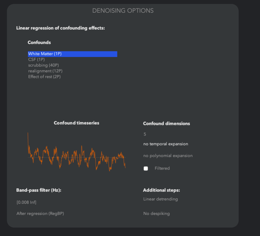 After applying these two fixes, the denoising process seems to be working, but the aCompCor variables still appear as "White Matter (1P)" and "CSF (1P)," as shown in the attached screenshots. Additionally, changing the confound dimensions from 5 to 10 doesn’t seem to have any effect. Could this be an issue if the data appears to be reasonably well denoised? If so, what would you recommend to address it?