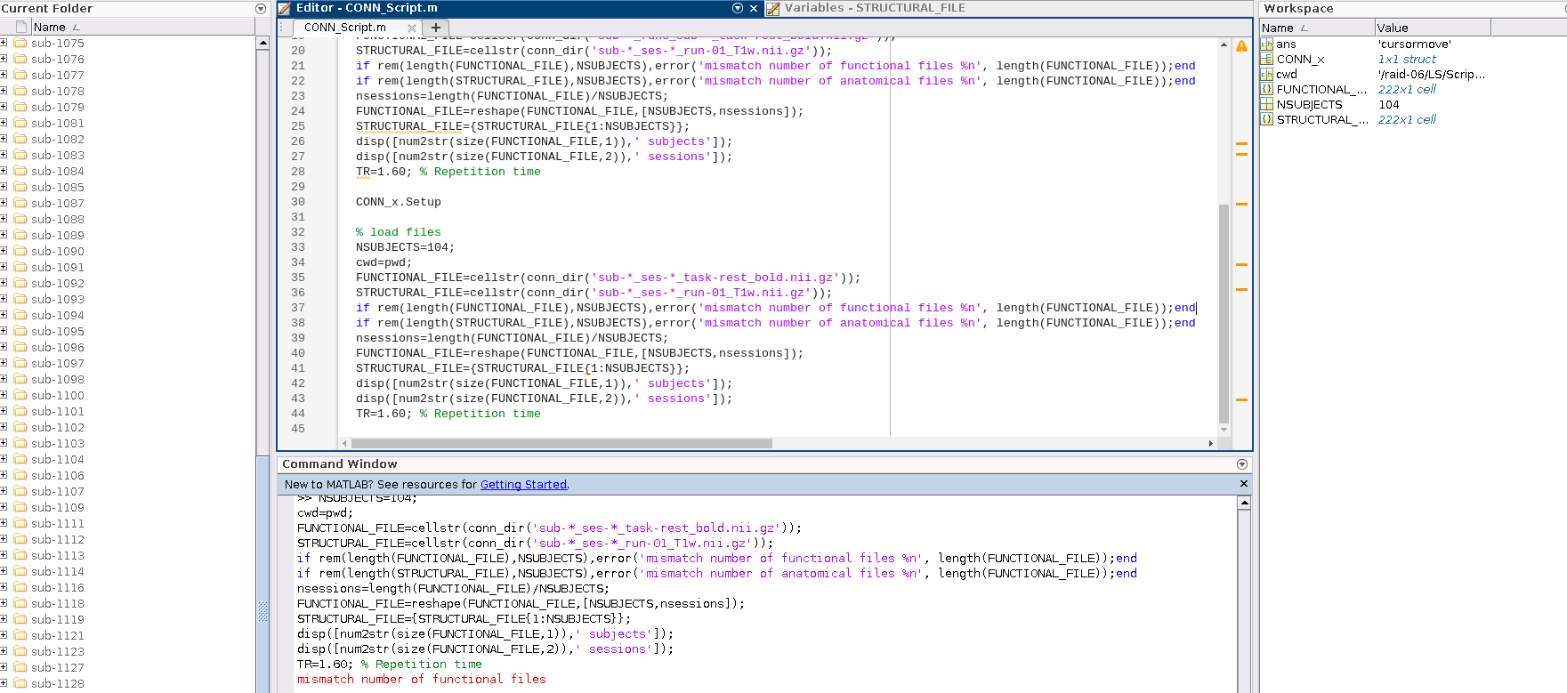 We are new to CONN and would love some help trying to set up preprocessing for resting state analysis. We are working with 104 participants, each with varying 1-3 sessions (totaling to 222 sessions), so we wanted to script for bulk importing scans to CONN. However, we have been stuck on the file loading step. We are using the code adapted from the conn_batch_workshop_nyudataset.m to load structural and functional files, but have been getting the error "mismatch number of functional files".