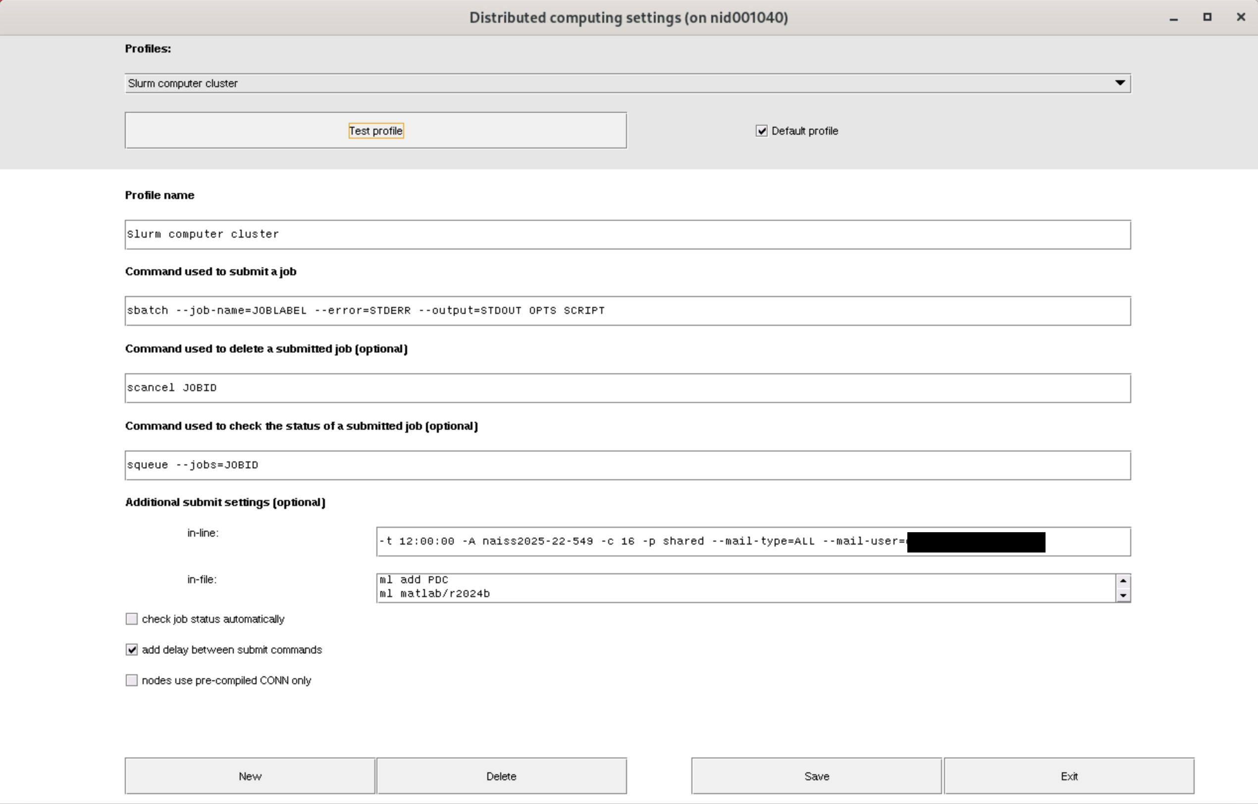 I got the slurm test to work through ThinLinc using the settings in the attached screenshot. And I provided the same settings in my local HPC config for slurm. But I still get the permanent hang when trying conn remotely.