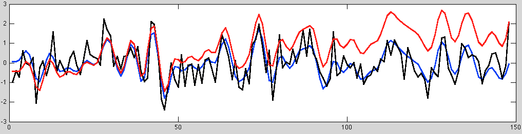 The odd thing is that the file that is the input to 3dFourier is nwmrda1779922_session_1_rest_1.nii.gz, which has already been detrended. I verified this by re-detrending the black line in the plot, and got the black line again. So somehow 3dFourier is finding a bogus trend in the data. My guess is that what it is doing is fitting a straight line through the first point, which is -1 and the last point, which is 2 and ignoring everything in between.