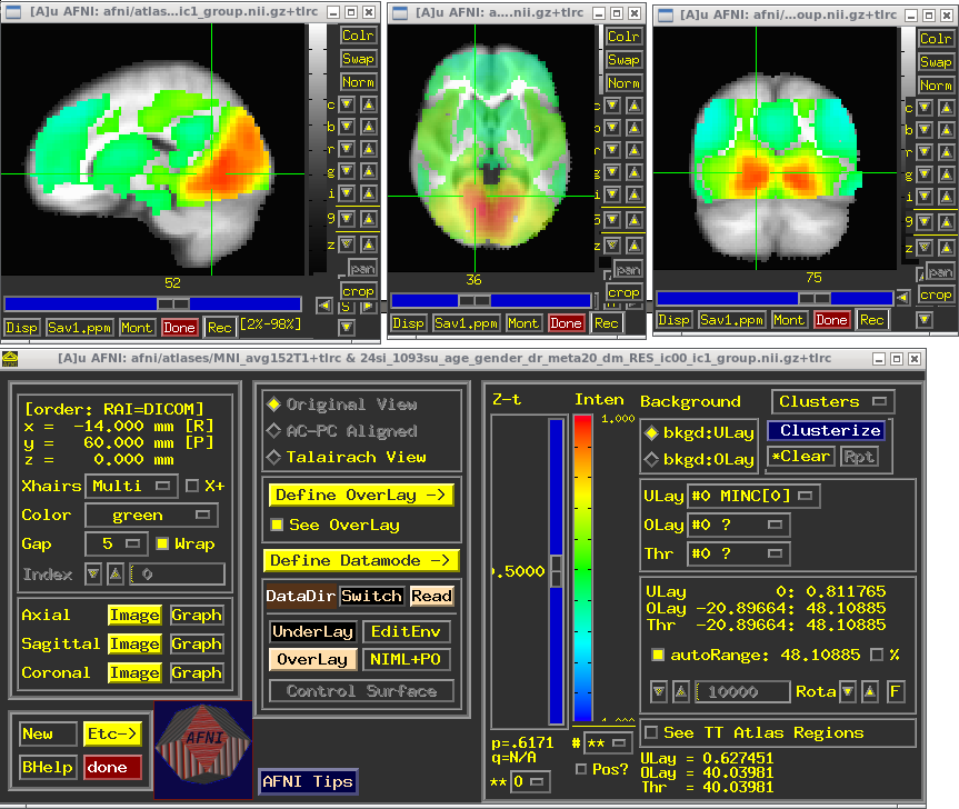 It is possible that I have missed something in the preprocessing of the Biswal et al. (2010) data, but I was wondering why the maps that have been made available do not cover the whole brain (they appear to be clipped at the top), and do not encompass the cerebellum. I have attached a screenshot for the 1st group-map IC compoment, that has been overlaid on the MNI_avg152T1 templated provided with AFNI, to illustrate.